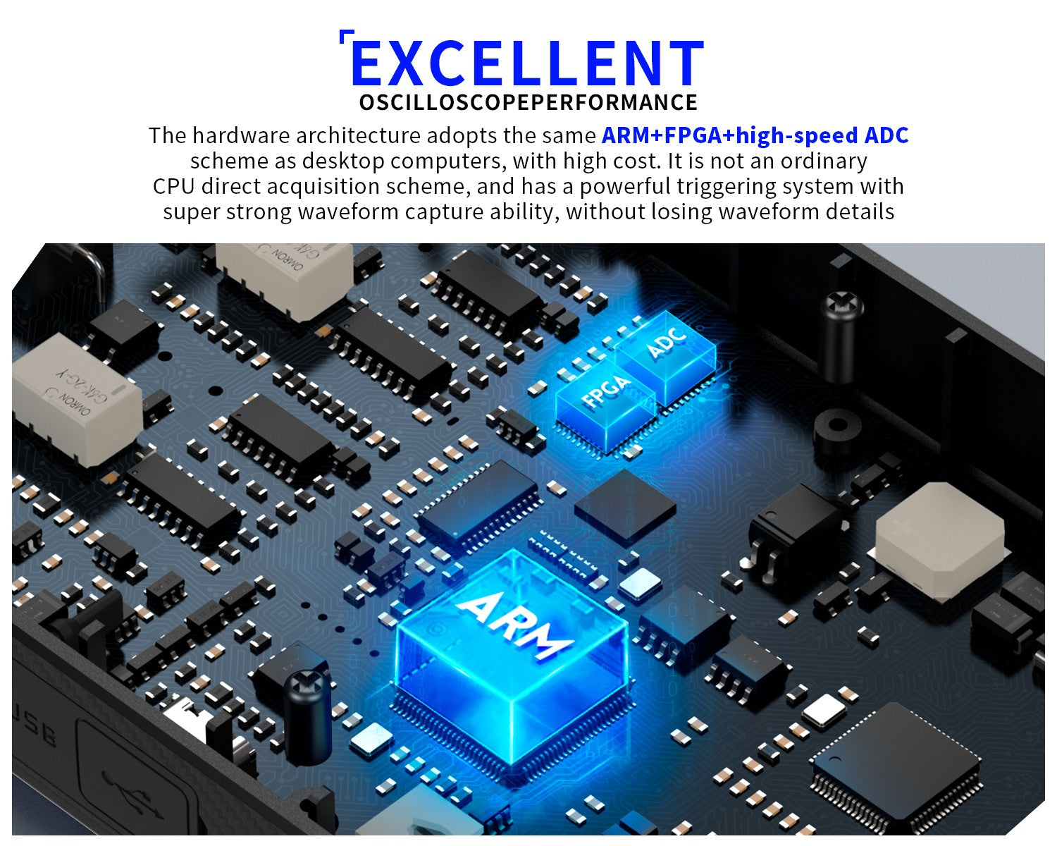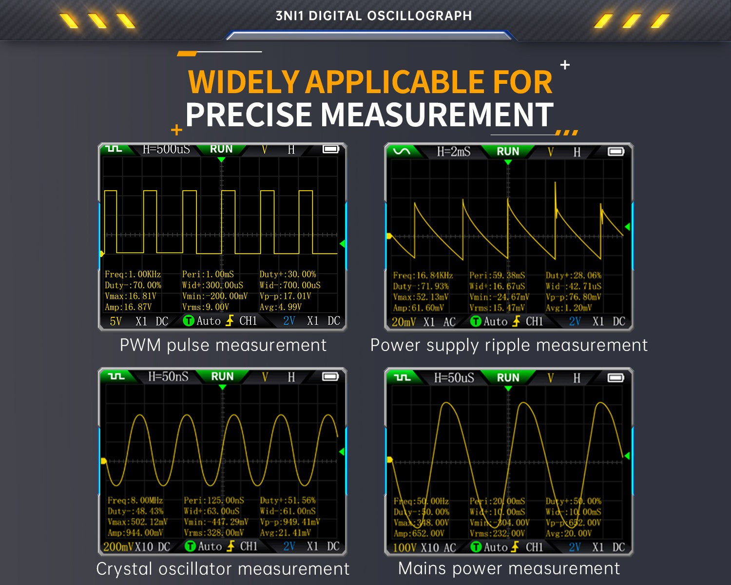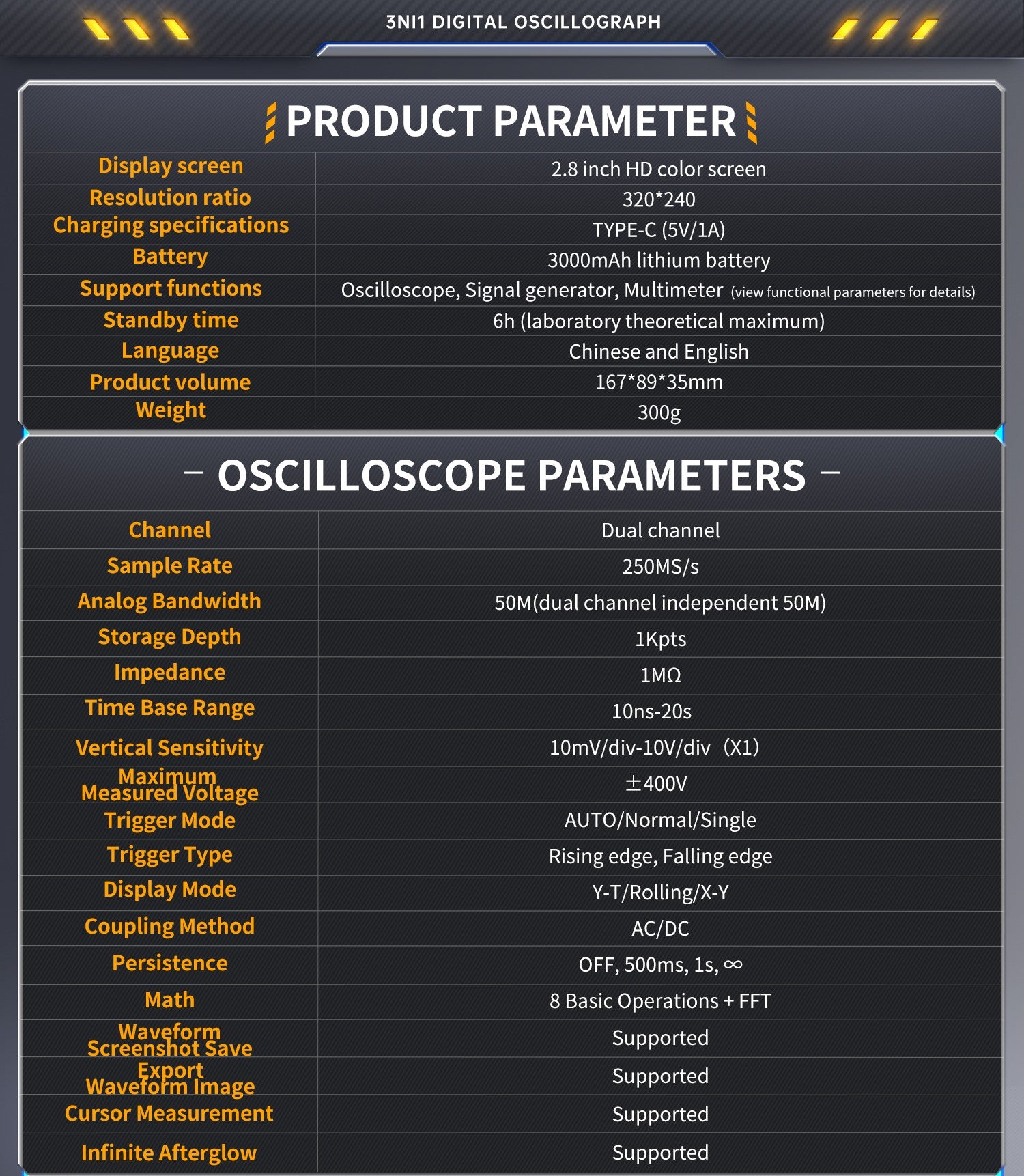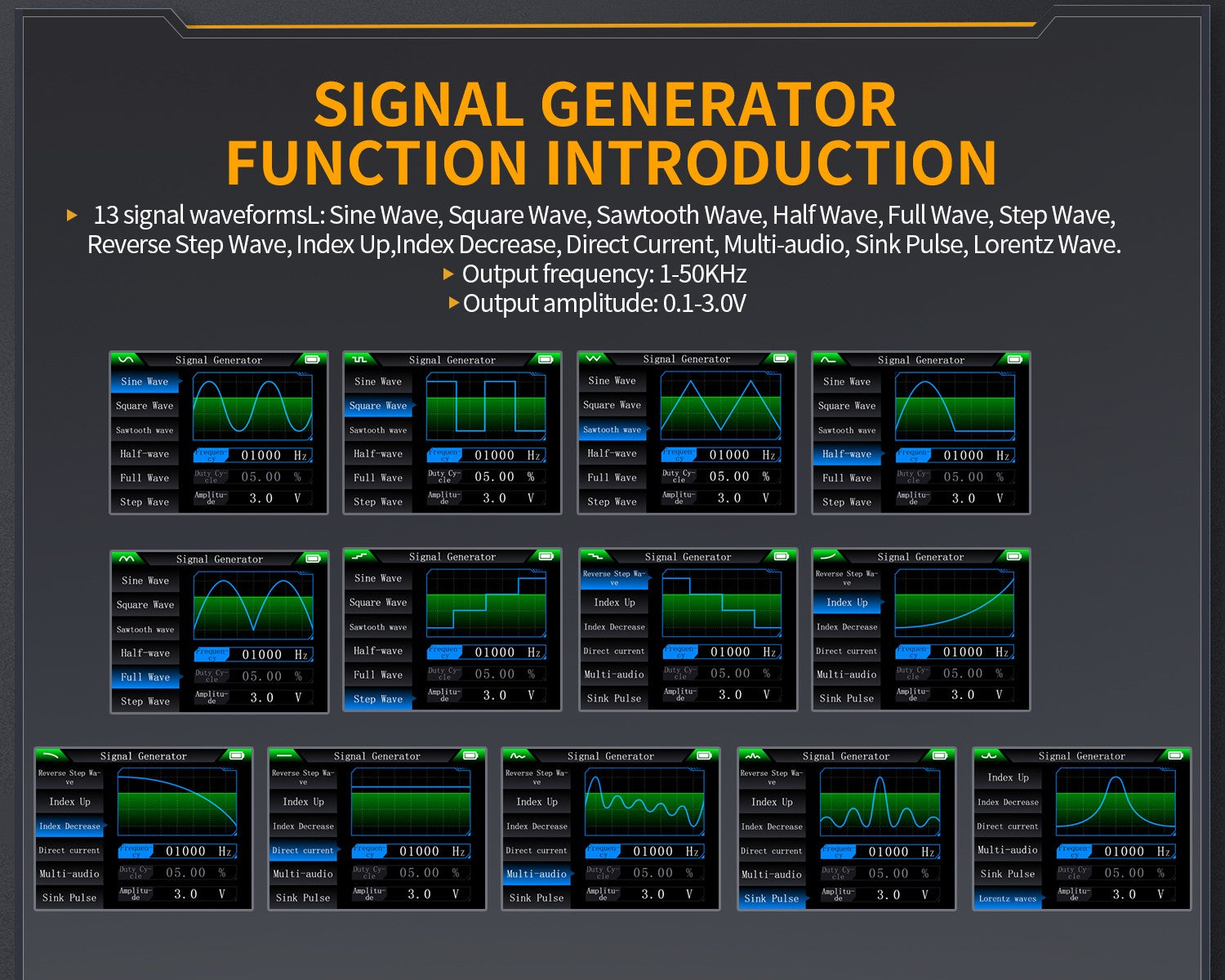 The built-in DDS function signal generator can output 13 types of function signals, with a maximum output frequency of 50KHz and a step size of 1Hz. The output frequency, amplitude, and duty cycle are adjustable. It features a 2.8-inch 320*240 resolution high-definition LCD screen and a built-in 3000mAh rechargeable lithium battery with a standby time of up to 6 hours. Its compact size provides users with more powerful practical functions and excellent portability.
